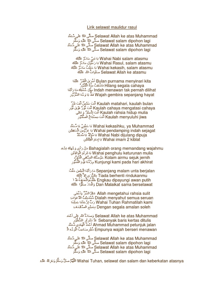 74 Lagu selawat semasa rehat 75 Nasyid 76 Berzanji Selawat 77 Forum 78 Jamuan 80 Anggaran Perbelanjaan Bil. Lirik selawat maulidur rasul-Jom sama-sama kita nasyidkan Lirik selawat maulidur rasul صلى الله على محمد Selawat Allah ke atas Muhammad صلى الله عليه وسلم Selawat salam dipohon lagi صلى الله على محمد Selawat Allah. Pada tanggal 12 Rabiul Awwal setiap tahun umat Islam diseluruh dunia akan mengadakan sambutan hari ulangtahun kelahiran Nabi Muhammad saw.